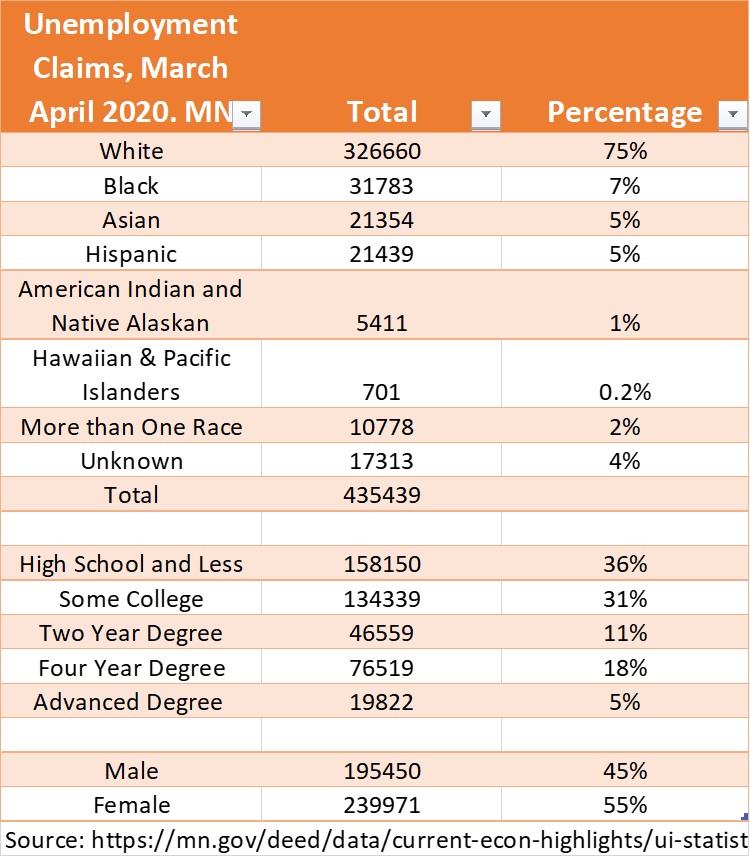 DEED provided data on unemployment claims by various categories. From the data we know in the last four weeks there were 435, 439 claims for unemployment insurance.
