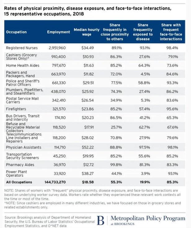 There are some proposals in this direction. Data on essential workers in this post is from the Brookings Institute Metropolitan Policy Program.
