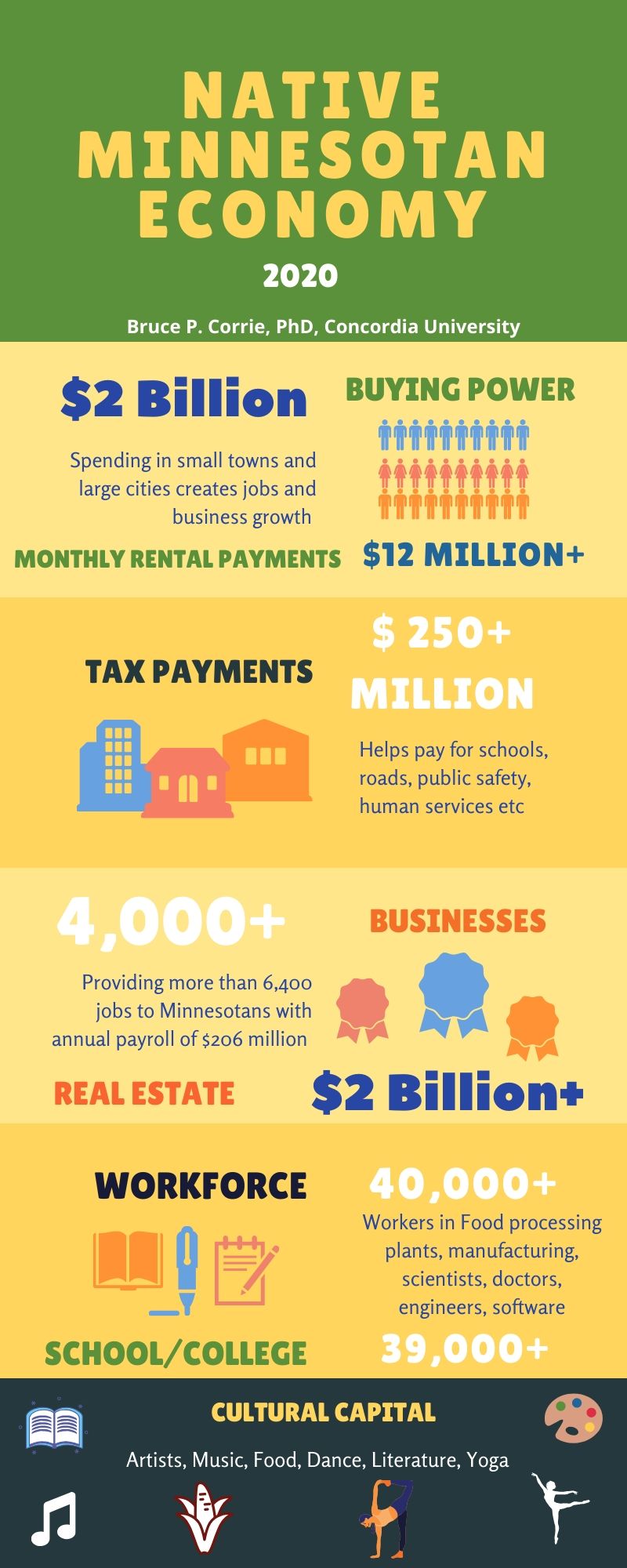 Download a fact sheet on the Native Economy of Minnesota- $2 billion buying power, $250 million tax payments, 4000 businesses, $2 billion real estate, 40,000 workers, 39,000 youth in schools and colleges, $12 million monthly rental payments. Time to invest now.
