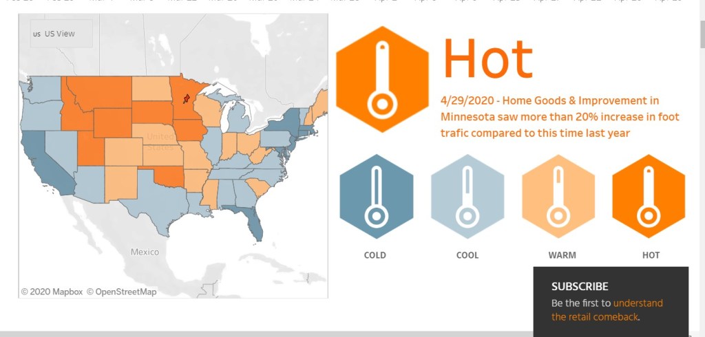 Unacast has offered a dashboard showing retail trends across the country using estimates of foot traffic in various retail sectors. The dashboard then ranks the country, state and sectors from hot (sales growing more than 20 percent) to cold (sales declines more than 20 percent).