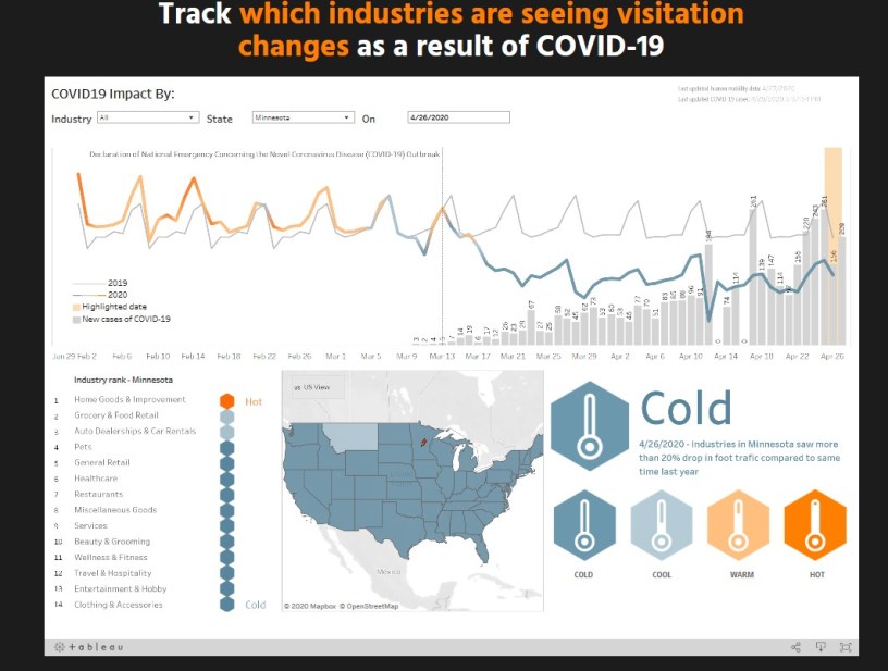 Unacast has offered a dashboard showing retail trends across the country using estimates of foot traffic in various retail sectors. The dashboard then ranks the country, state and sectors from hot (sales growing more than 20 percent) to cold (sales declines more than 20 percent).