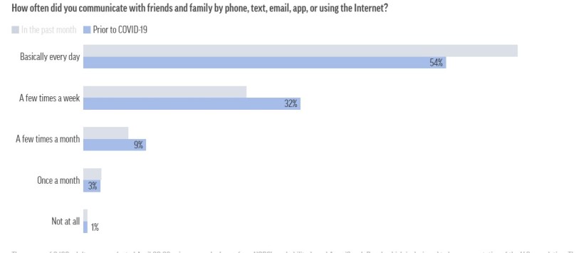 Majority of respondents reported an increase in daily connections with family and friends. 8 in 10 report wearing face masks and around half reported working during the crisis. However, anxiety levels and depression levels are also up, especially so for younger adults and women. Across racial groups the highest level of anxiety was reported by Hispanic respondents.